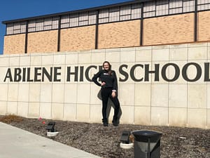 Sophomore, Trinity McMillan stands outside by the Abilene Highschool sign in her “impact the cure” shirt.