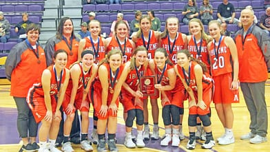 Jade Vopat (front row, far left) with the girls’ basketball last season after their third place finish in the SIT.