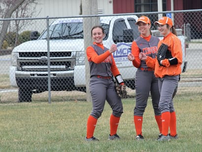 Jade, left, with Rylie Volkman and Kayley Taylor, during a softball scrimmage last year.