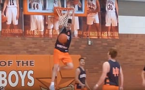 Tim Barbieri, center, dunks during practice before the Clay game as Jayshaun Jones (back) and Preston Boyd (44) watch.