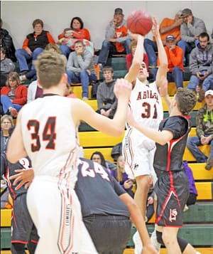 Colton McVan (33) sinks a three during the fourth quarter of the finale game against Liberal as Kaleb Becker (34) watches.
