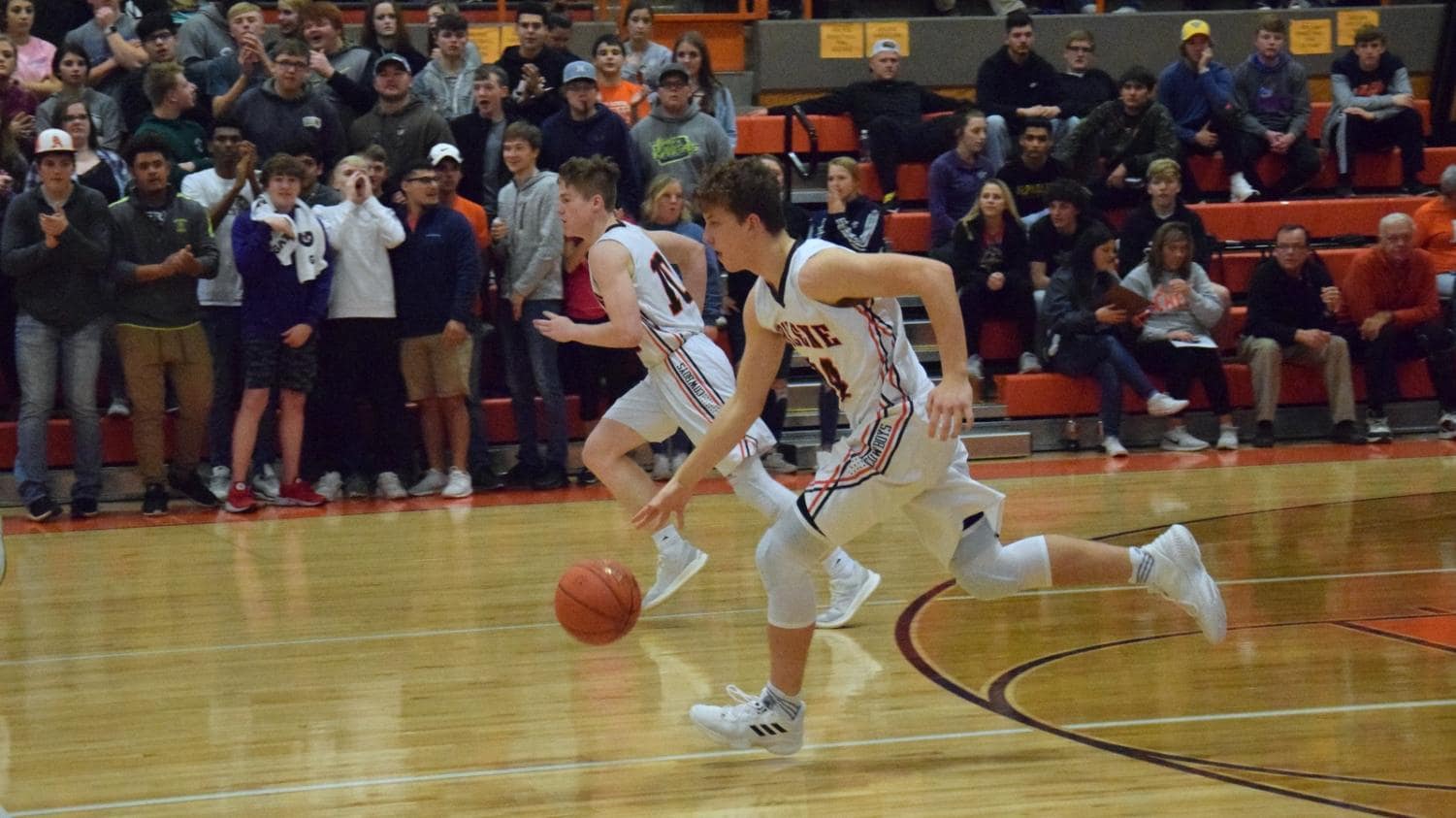HAYS, KS – Thomas More Prep-Marian – Three minutes had passed, and head boys’ basketball coach Terry Taylor knew it was time to enact his strategy. At the whistle, out came the five starters in brown, and into the game came five different ones. Of course, the highlight of that group, to many casual Cowboy fans, were underclassmen Josh Stuber (sophomore) and Kaleb Becker (freshman). Still, two of the more productive chess pieces Taylor enlists are seniors – Colton McVan, older brother of student section fan favorite Blaise McVan, and Wyatt Davis.