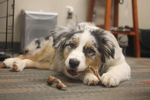 Ike, the young Australian Shepard, is only about five months old, so he is not yet an officially certified therapy dog. Therapy dogs to-be are typically evaluated when they are a year old.