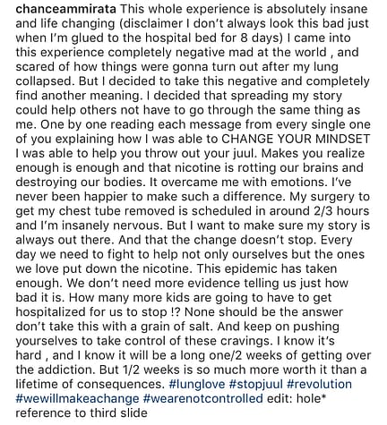 On August 5th, 2019, 18-year-old Chance Ammirata‘s lung collapsed due to juuling. Ammirata described the pain being extreme, comparing it to a heart attack.